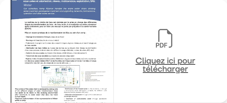 Kamp Alliance propose des réponses pour la chaîne complète de l’eau : traitement de l’eau potable, traitement des eaux usées et valorisation, réseaux, maintenance, exploitation, SAV. La maîtrise de la chaîne de l’eau est réalisée par la prise en charge des différentes étapes de transformation de l’eau : de l’eau brute, à sa restitution au milieu récepteur après traitement, pour en faire une eau qui ne porte par préjudice à la santé humaine (EDCH).